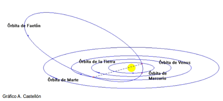 La siguiente animación representa la órbita calculada en comparación con la de la Tierra: