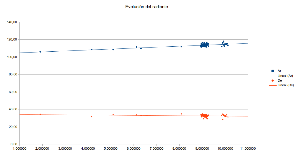 La ascensión recta experimentó un suave crecimiento en el intervalo [105º, 117º], mientras que la declinación se mantuvo casi constante en torno a los 33º, o sea, lo esperado para este enjambre.